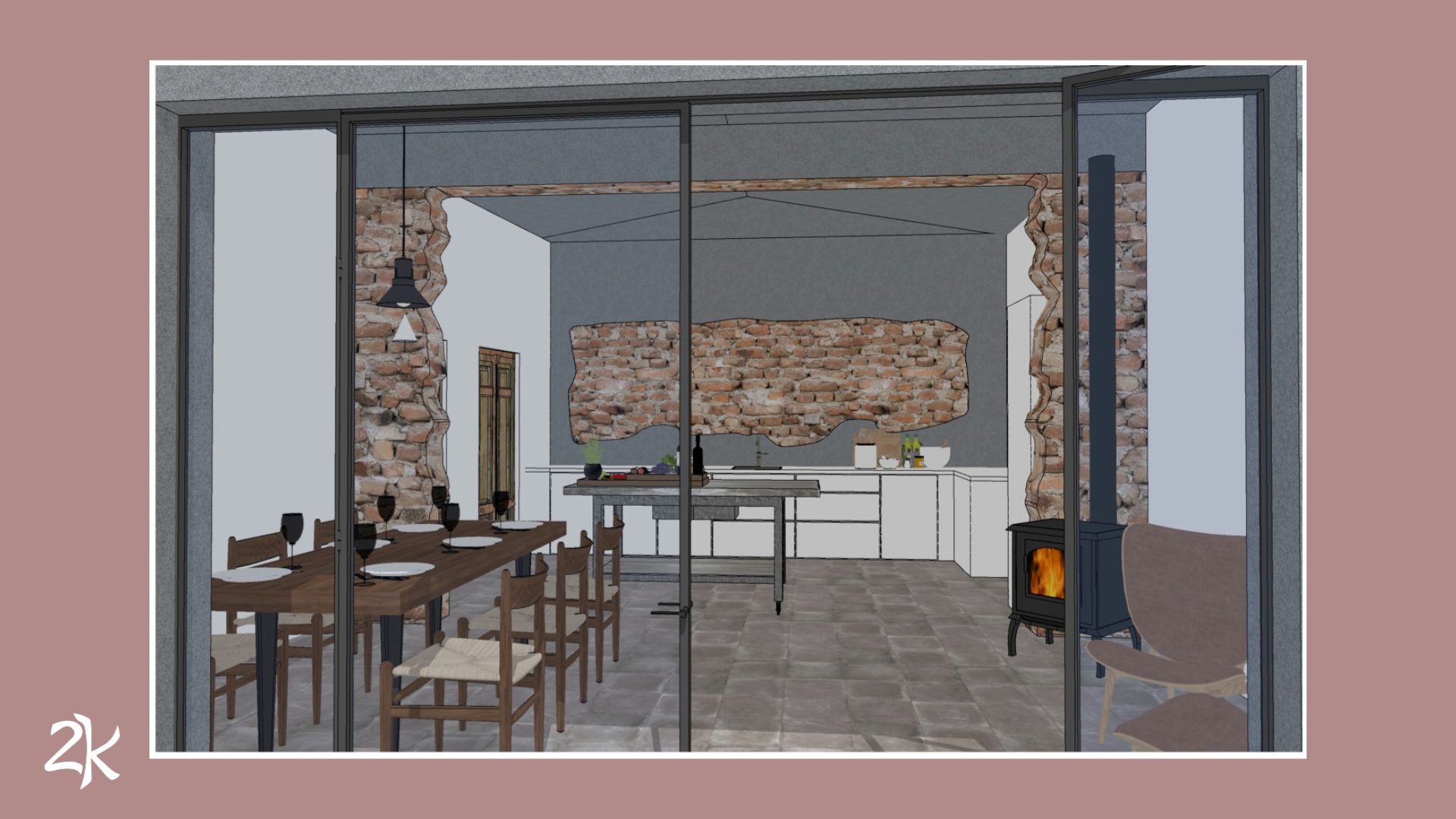 De enorme woonkeuken met haard , gebouwd in authentieke stijl heeft een afmeting van 5.90 x 7.25 met een hoogte van 5.00 meter. De woonkeuken grenst aan de gezellige patio bereikbaar via de grote schuifpuien, met heerlijke plekken om te genieten van de slow-life van de Algarve. Leuk detail is de originele waterput die nog steeds gebruikt kan worden voor de planten. Gemetselde bank met fraai Portugees tegelwerk en vast plantenbak met bananen planten. De keuken is voorzien van een kookplaat, afzuigkap, oven, magnetron, koelkast en vaatwasser.