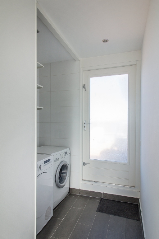 The elevator takes you to the top floor and brings you into the penthouse. The beautiful bright spacious living room with open kitchen offers lots of light and a beautiful view of Scheveningen and both of the harbors. From the living room you also have access to the largest terrace of the house where you can watch the setting sun while enjoying a snack and a drink. The kitchen has all the necessary appliances; fridge, freezer, induction stove, hood and oven. In the living room you have access to an internal storage room/pantry.