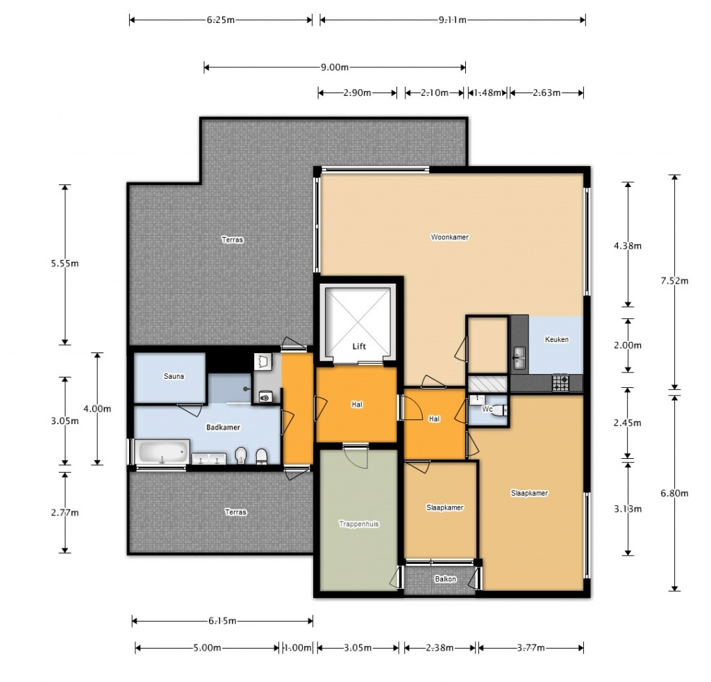 In de hal richting de slaapkamers is het separate toilet te vinden. De master bedroom beschikt over inbouwkasten. vanuit de master bedroom komt u langs de 2e slaapkamer, richting de hal welke uitkomt in de wasruimte. Deze ruimte is voorzien van een wasmachine en droger. Vanuit deze ruimte heeft u toegang tot het 2e terras van de woning. Aangrenzend aan deze ruimte bevindt zich de ruime badkamer met bad, aparte douche, dubbele wastafel, toilet, bidet en sauna.